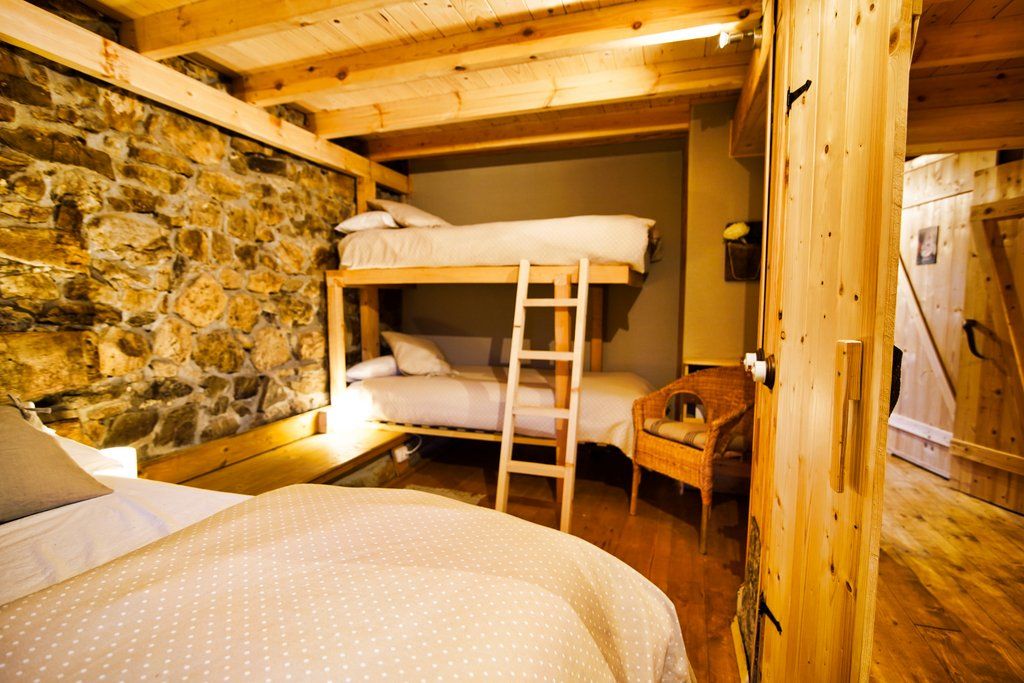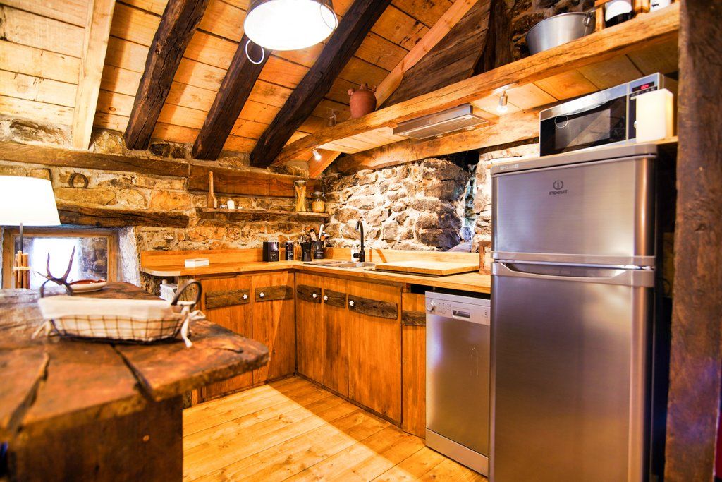 La cabaña «Iduna» es perfecta para dos parejas o una familia de hasta 6 personas. En el piso superior, un amplio salón con sofá, chimenea y cocina completamente equipada. En el piso inferior, un dormitorio principal con baño integrado y una habitación con una cama doble y una litera de dos camas, junto a un segundo baño compartido. Con una terraza sombreada por un gran fresno y un prado de 7,000 m2, todo delimitado por muretes de piedra y acceso en coche directo, ofrece un entorno tranquilo y acogedor.